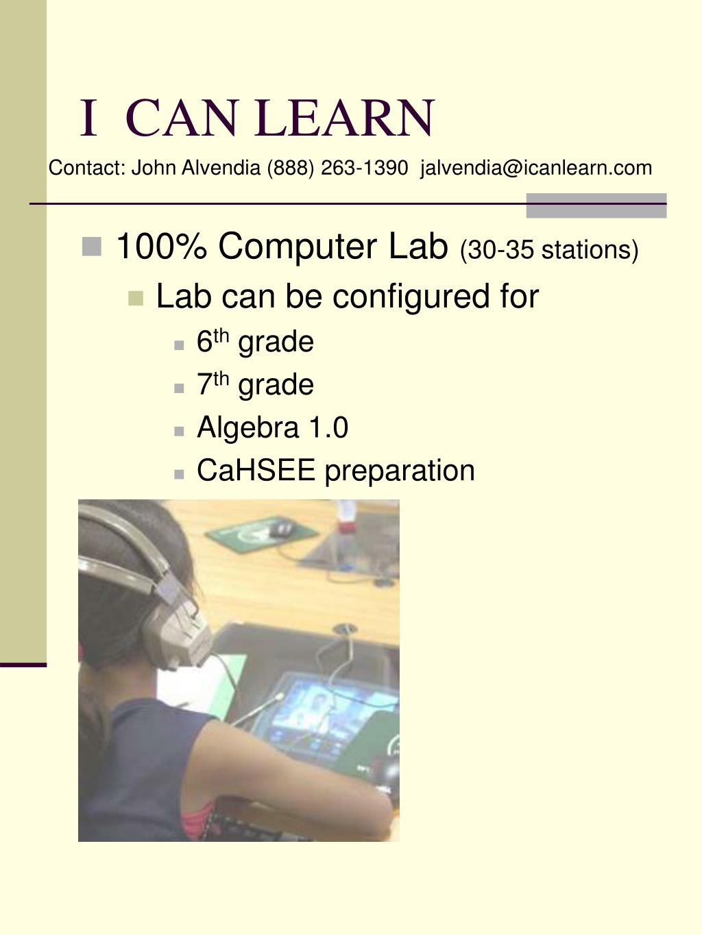 I CAN LEARN Contact: John Alvendia (888) 263-1390 jalvendia@icanlearn.com • 100% Computer Lab (30-35 stations) • Lab can be configured for • 6th grade • 7th grade • Algebra 1.0 • CaHSEE preparation