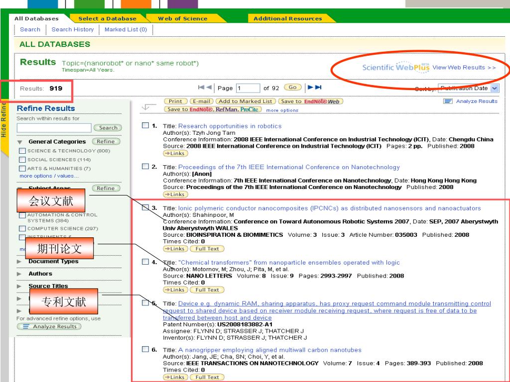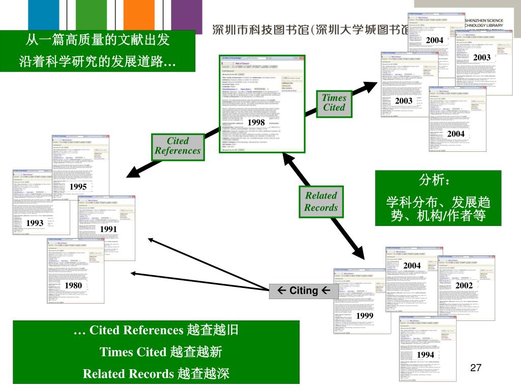 从一篇高质量的文献出发 沿着科学研究的发展道路… 2004 2003 Times Cited 2003 1998 2004 Cited References 分析: 学科分布、发展趋势、机构/作者等 1995 Related Records 1993 1991 2004 1980 2002 Citing 1999 … Cited References 越查越旧 Times Cited 越查越新 Related Records 越查越深 1994 27
