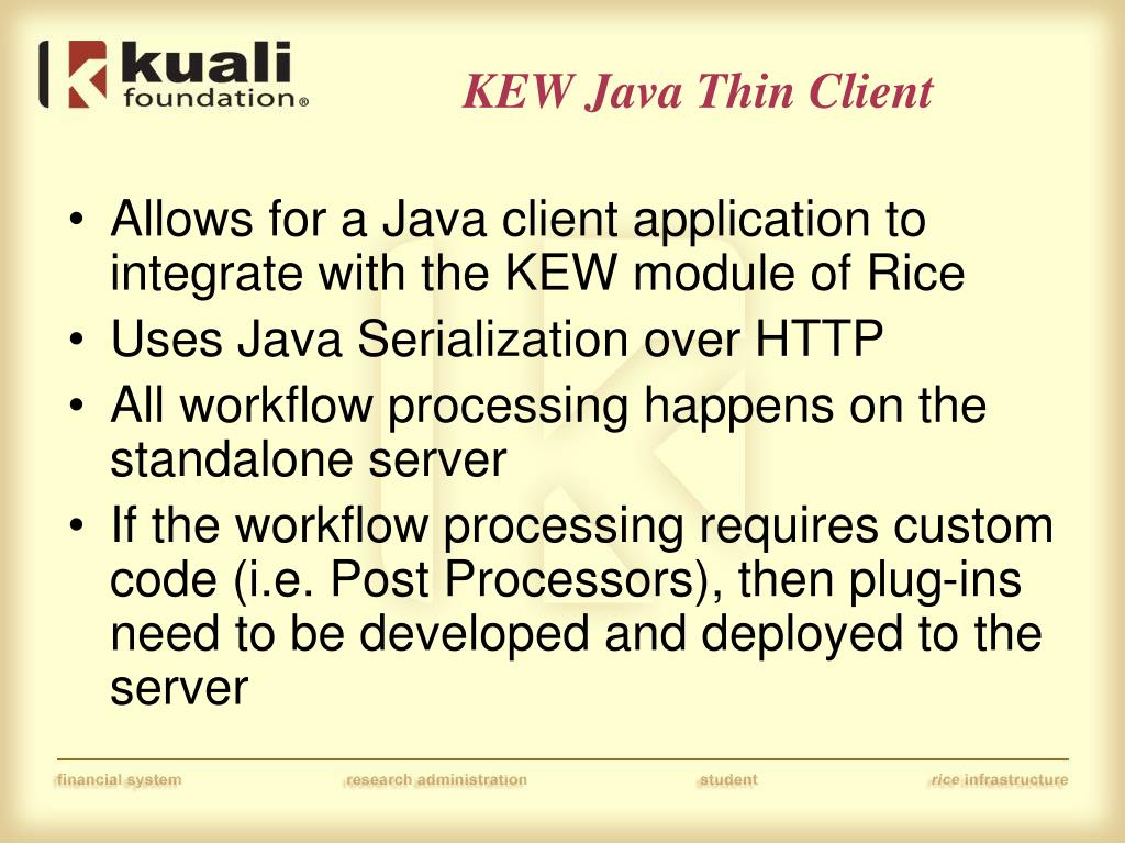 KEW Java Thin Client • Allows for a Java client application to integrate with the KEW module of Rice • Uses Java Serialization over HTTP • All workflow processing happens on the standalone server • If the workflow processing requires custom code (i.e. Post Processors), then plug-ins need to be developed and deployed to the server