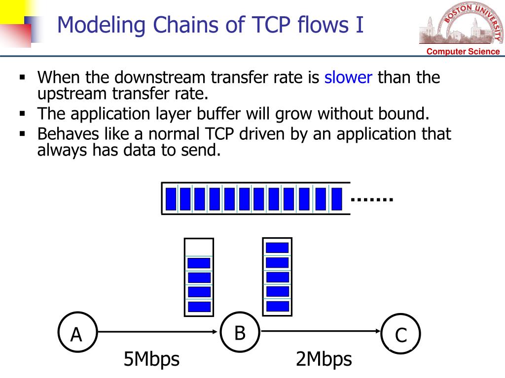 Modeling Chains of TCP flows I C B A 5Mbps 2Mbps • When the downstream transfer rate is slower than the upstream transfer rate. • The application layer buffer will grow without bound. • Behaves like a normal TCP driven by an application that always has data to send.