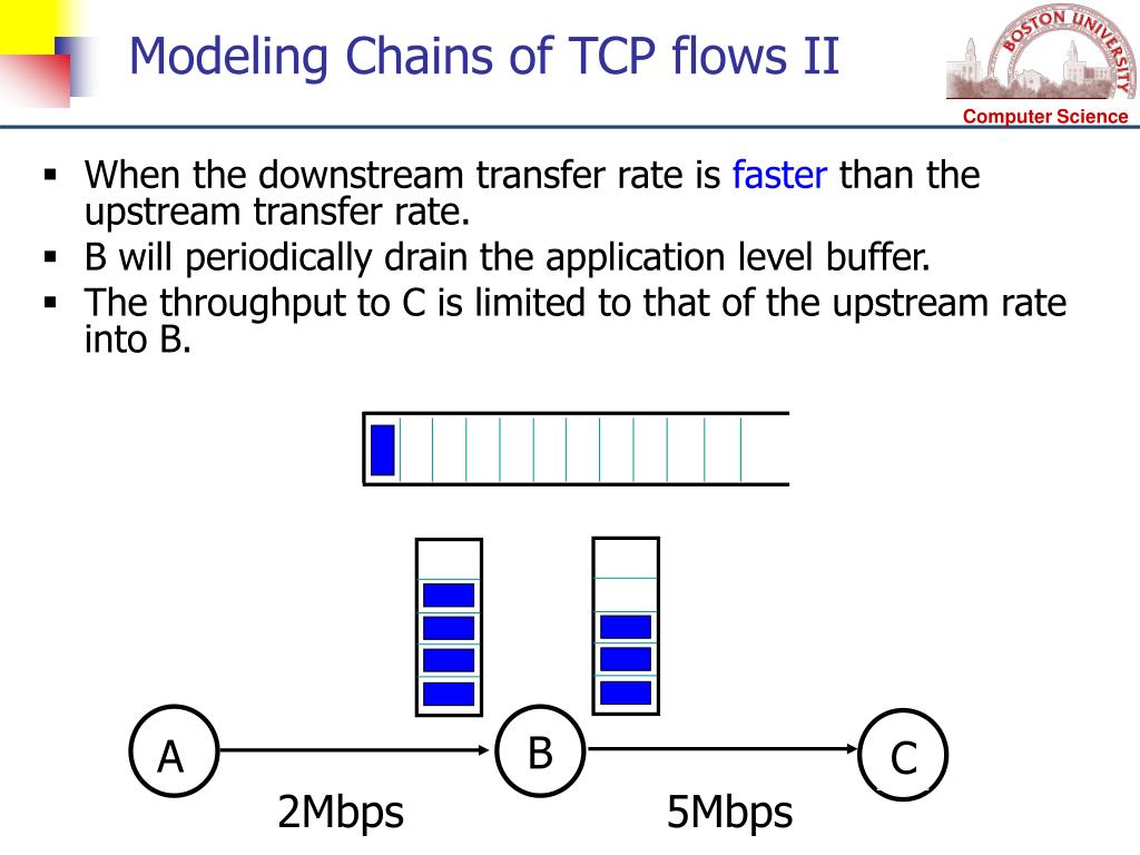 Modeling Chains of TCP flows II C B A 2Mbps 5Mbps • When the downstream transfer rate is faster than the upstream transfer rate. • B will periodically drain the application level buffer. • The throughput to C is limited to that of the upstream rate into B.