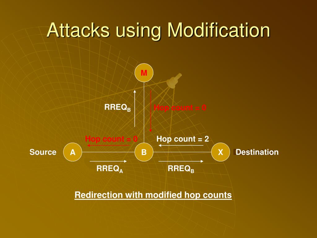 M RREQB Hop count = 0 Hop count = 0 Hop count = 2 A B X Source Destination RREQA RREQB Attacks using Modification Source Destination Redirection with modified hop counts