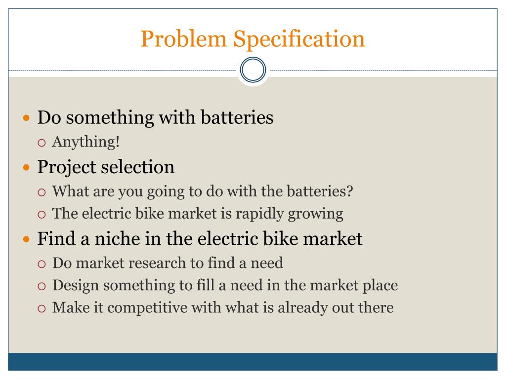 Problem Specification • Do something with batteries • Anything! • Project selection • What are you going to do with the batteries? • The electric bike market is rapidly growing • Find a niche in the electric bike market • Do market research to find a need • Design something to fill a need in the market place • Make it competitive with what is already out there