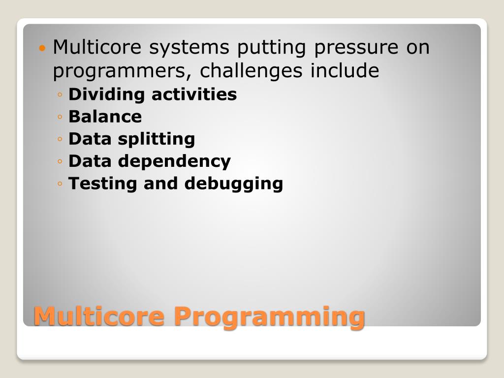 Multicore systems putting pressure on programmers, challenges include • Dividing activities • Balance • Data splitting • Data dependency • Testing and debugging Multicore Programming