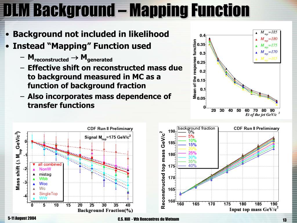 DLM Background – Mapping Function • Background not included in likelihood • Instead “Mapping” Function used • Mreconstructed Mgenerated • Effective shift on reconstructed mass due to background measured in MC as a function of background fraction • Also incorporates mass dependence of transfer functions C.S. Hill - Vth Rencontres du Vietnam