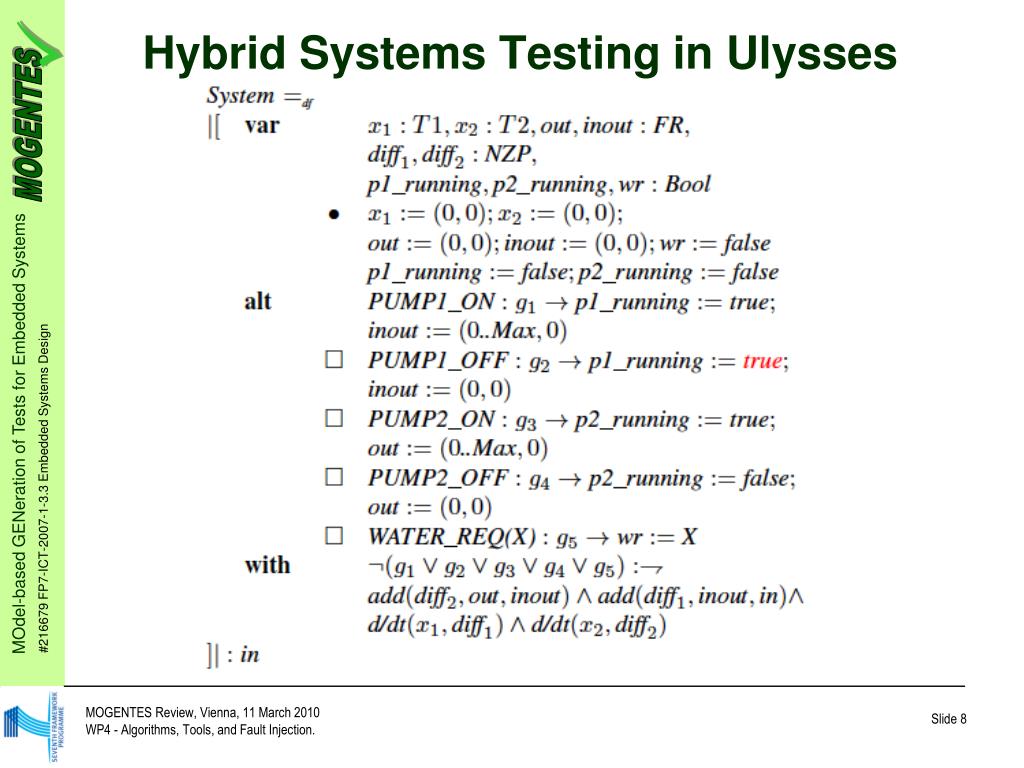 Hybrid Systems Testing in Ulysses For environmental evolution: • Qualitative reasoning engine: ASIM • Ported from GNU to Sicstus Prolog