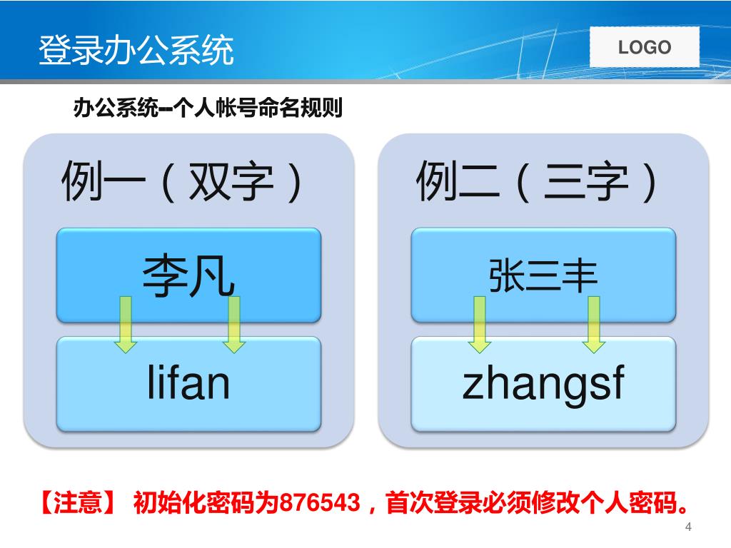登录办公系统 办公系统--个人帐号命名规则 【注意】 初始化密码为876543,首次登录必须修改个人密码。