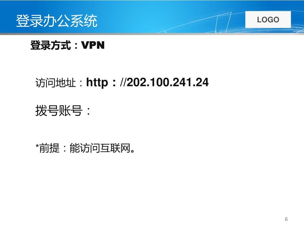 登录办公系统 登录方式:VPN 访问地址:http://202.100.241.24 拨号账号: *前提:能访问互联网。