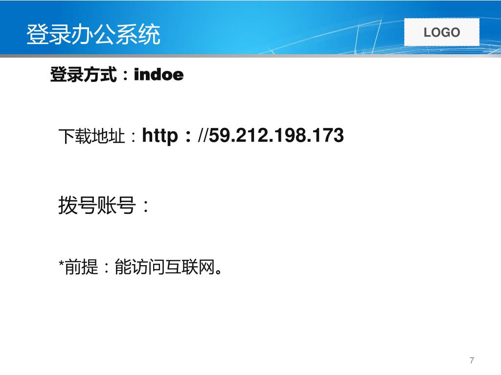 登录办公系统 登录方式:indoe 下载地址:http://59.212.198.173 拨号账号: *前提:能访问互联网。