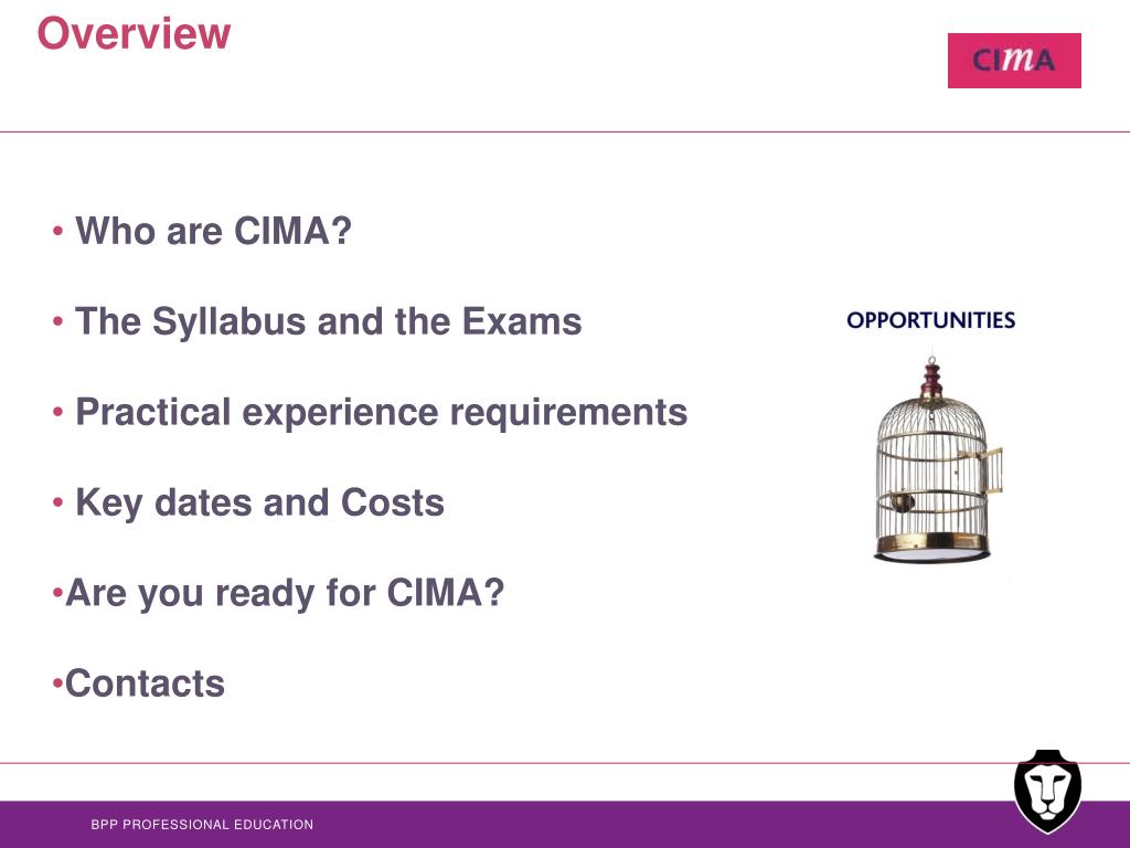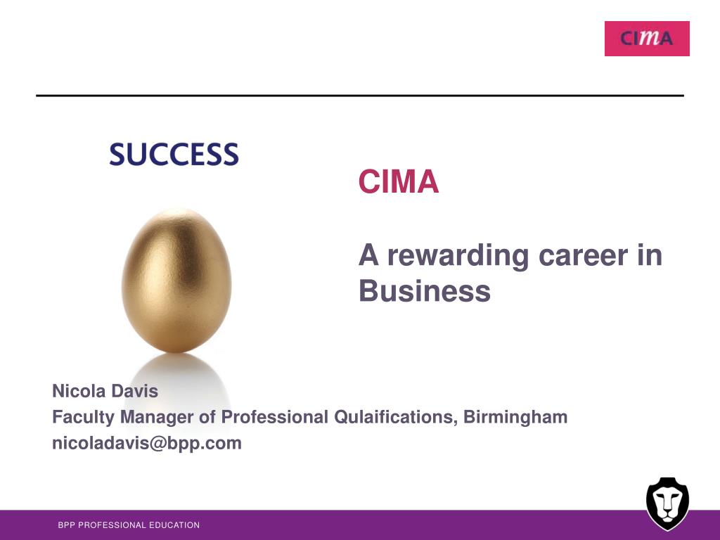 CIMA A rewarding career in Business. Nicola Davis Faculty Manager of Professional Qulaifications , Birmingham nicoladavis@bpp.com. Overview. Who are CIMA? The Syllabus and the Exams Practical experience requirements Key dates and Costs Are you ready for CIMA? Contacts.
