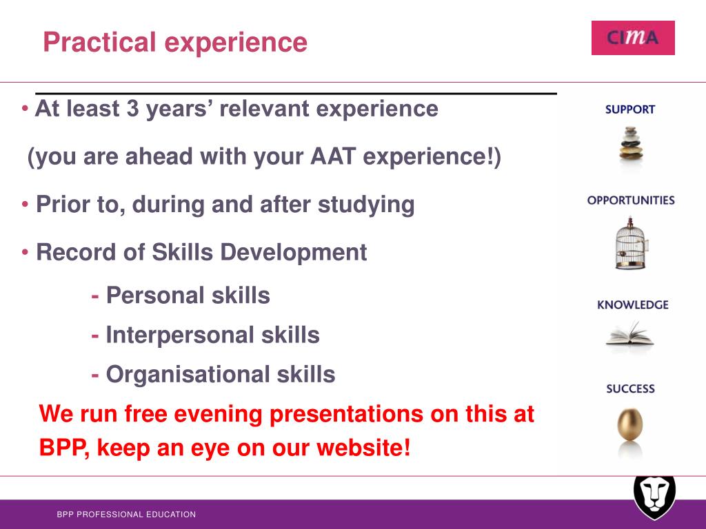 Practical experience • At least 3 years’ relevant experience • (you are ahead with your AAT experience!) • Prior to, during and after studying • Record of Skills Development • - Personal skills • - Interpersonal skills • -Organisational skills • We run free evening presentations on this at BPP, keep an eye on our website!