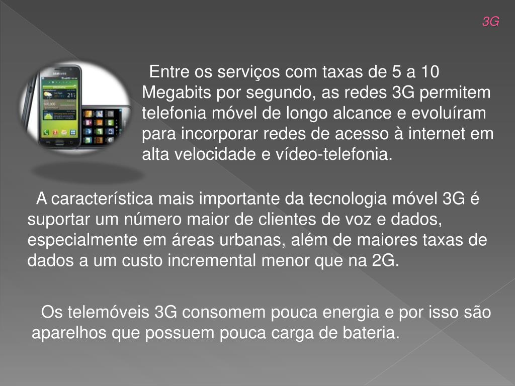 3G Entre os serviços com taxas de 5 a 10 Megabits por segundo, as redes 3G permitem telefonia móvel de longo alcance e evoluíram para incorporar redes de acesso à internet em alta velocidade e vídeo-telefonia. A característica mais importante da tecnologia móvel 3G é suportar um número maior de clientes de voz e dados, especialmente em áreas urbanas, além de maiores taxas de dados a um custo incremental menor que na 2G. Os telemóveis 3G consomem pouca energia e por isso são aparelhos que possuem pouca carga de bateria.