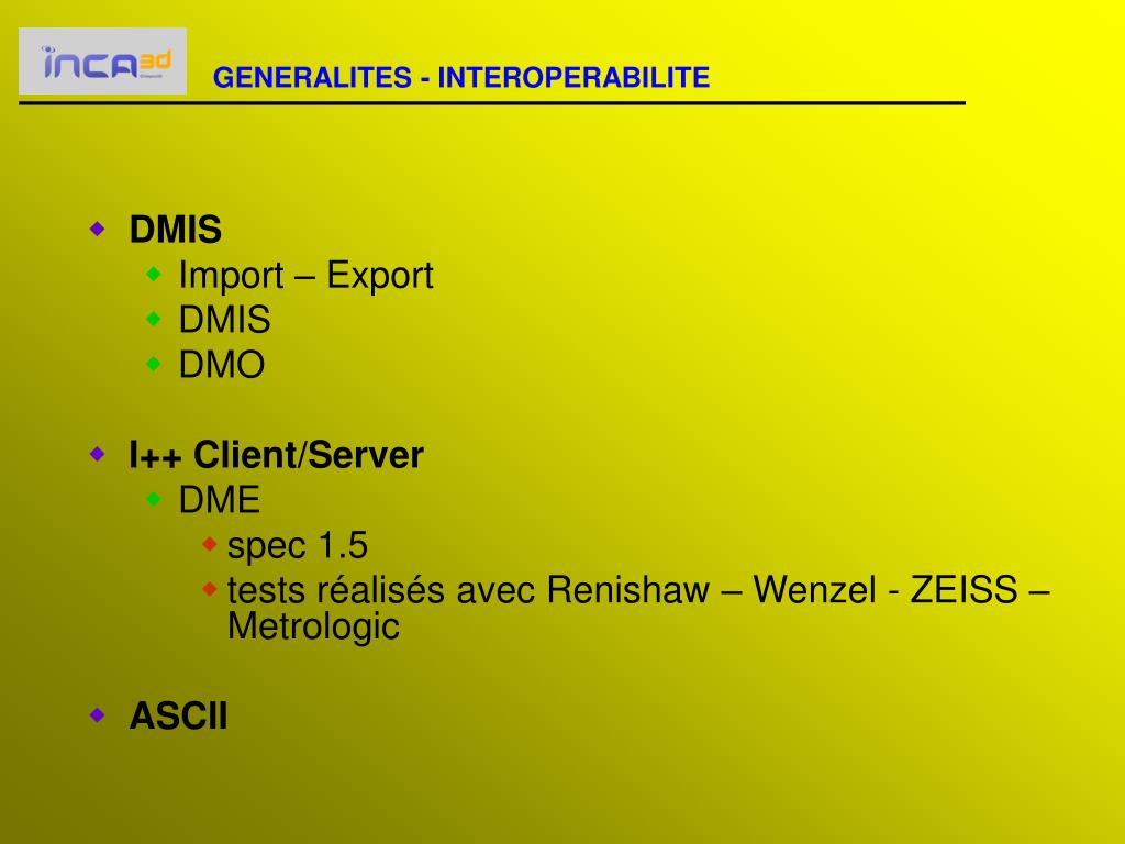 GENERALITES - INTEROPERABILITE • DMIS • Import – Export • DMIS • DMO • I++ Client/Server • DME • spec 1.5 • tests réalisés avec Renishaw – Wenzel - ZEISS – Metrologic • ASCII