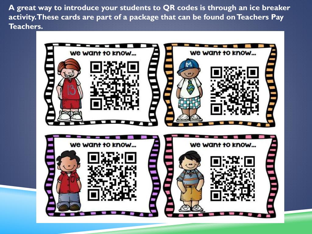 A great way to introduce your students to QR codes is through an ice breaker activity. These cards are part of a package that can be found on Teachers Pay Teachers.