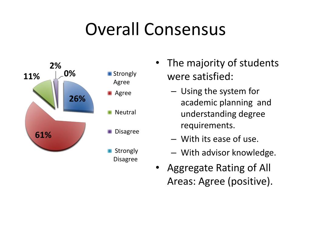 Overall Consensus • The majority of students were satisfied: • Using the system for academic planning and understanding degree requirements. • With its ease of use. • With advisor knowledge. • Aggregate Rating of All Areas: Agree (positive).