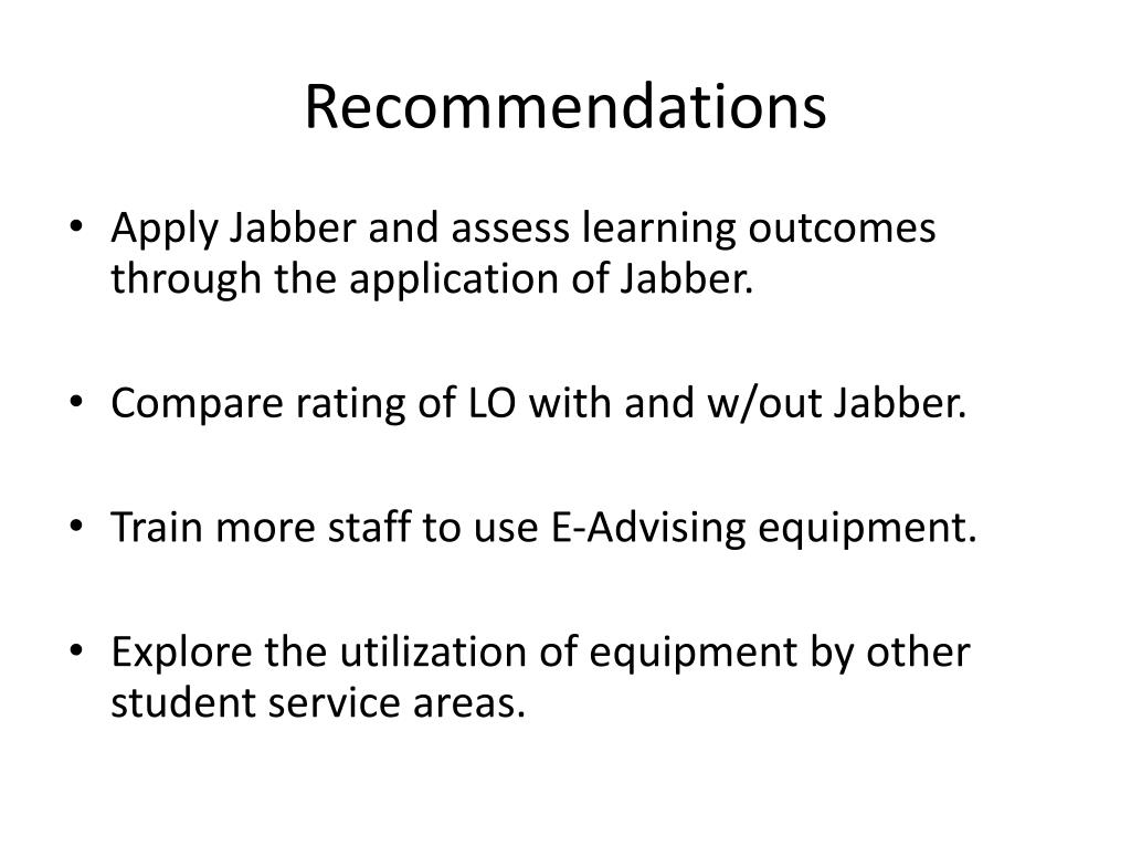 Recommendations • Apply Jabber and assess learning outcomes through the application of Jabber. • Compare rating of LO with and w/out Jabber. • Train more staff to use E-Advising equipment. • Explore the utilization of equipment by other student service areas.