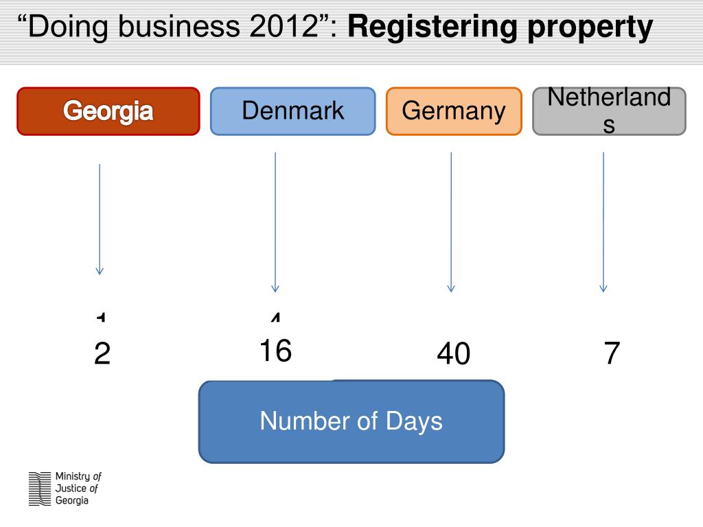 “Doing business 2012”: Registering property • Georgia • Denmark • Germany • Netherlands • 5 • 5 • 1 • 4 • 40 • 7 • 2 • 16 • Number of Procedures • Number of Days