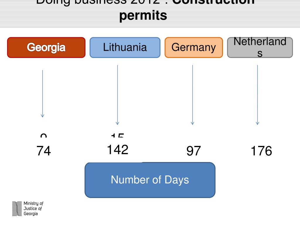 “Doing business 2012”: Construction permits • Georgia • Lithuania • Germany • Netherlands • 9 • 15 • 9 • 15 • 97 • 176 • 74 • 142 • Number of Procedures • Number of Days