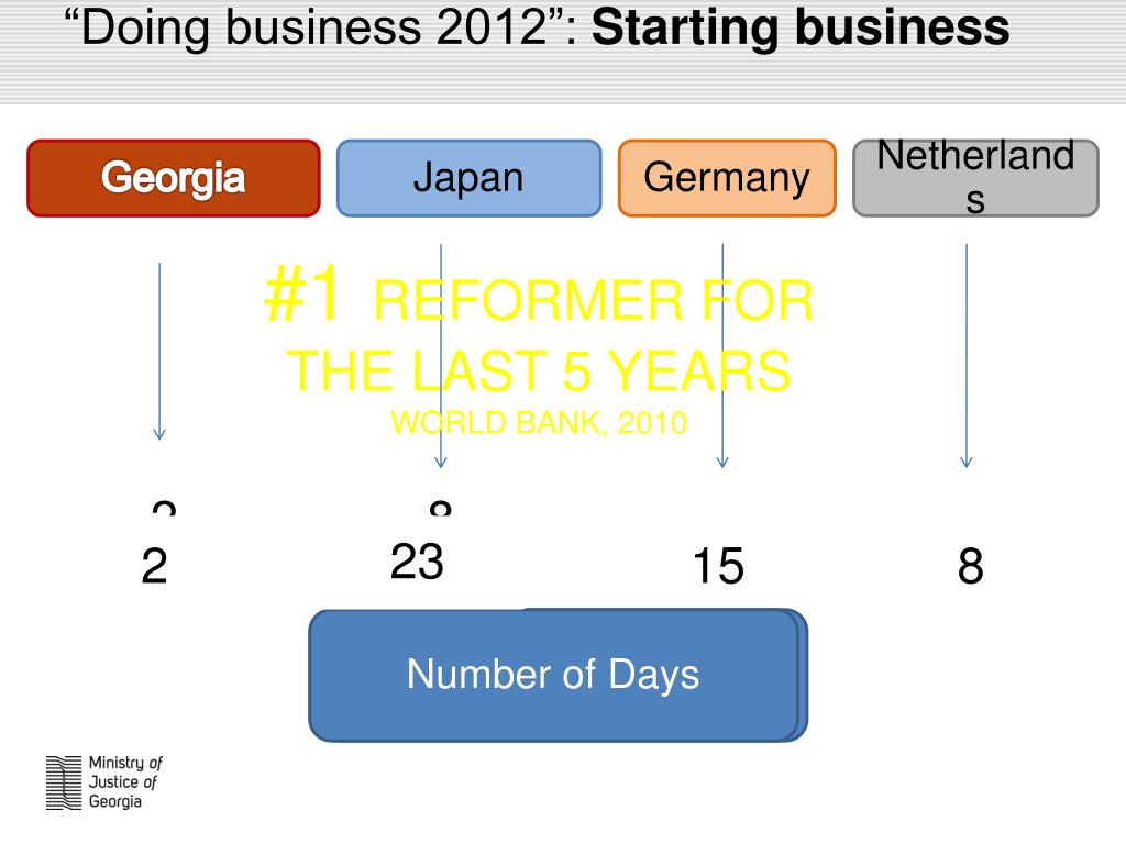 “Doing business 2012”: Starting business • Georgia • Japan • Germany • Netherlands #1 REFORMER FOR THE LAST 5 YEARS WORLD BANK, 2010 • 9 • 6 • 2 • 8 • 15 • 8 • 2 • 23 • Number of Days • Number of Procedures