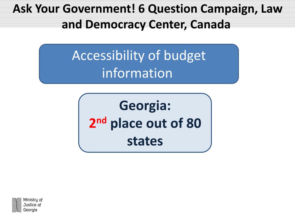 Ask Your Government! 6 Question Campaign, Law and Democracy Center, Canada Accessibility of budget information Georgia: 2nd place out of 80 states