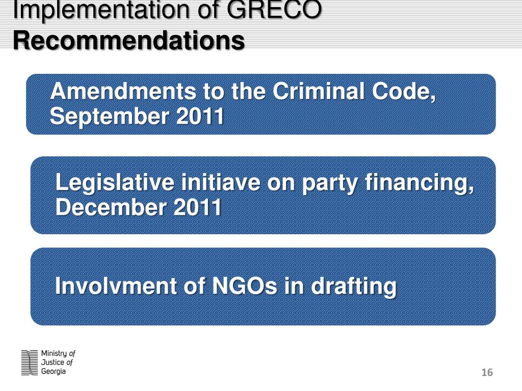 Implementation of GRECO Recommendations • Amendments to the Criminal Code, September 2011 Legislative initiave on party financing, December 2011 Involvment of NGOs in drafting