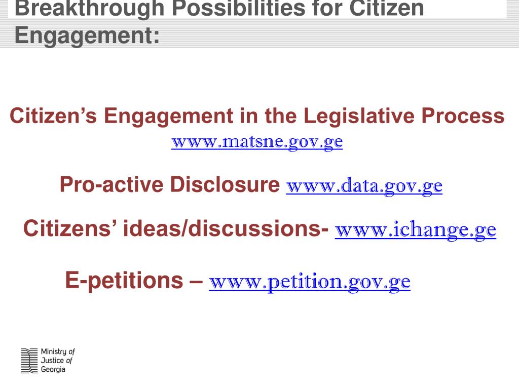 Breakthrough Possibilities for CitizenEngagement: Citizen’s Engagement in the Legislative Process www.matsne.gov.ge Pro-active Disclosure www.data.gov.ge Citizens’ ideas/discussions- www.ichange.ge E-petitions – www.petition.gov.ge