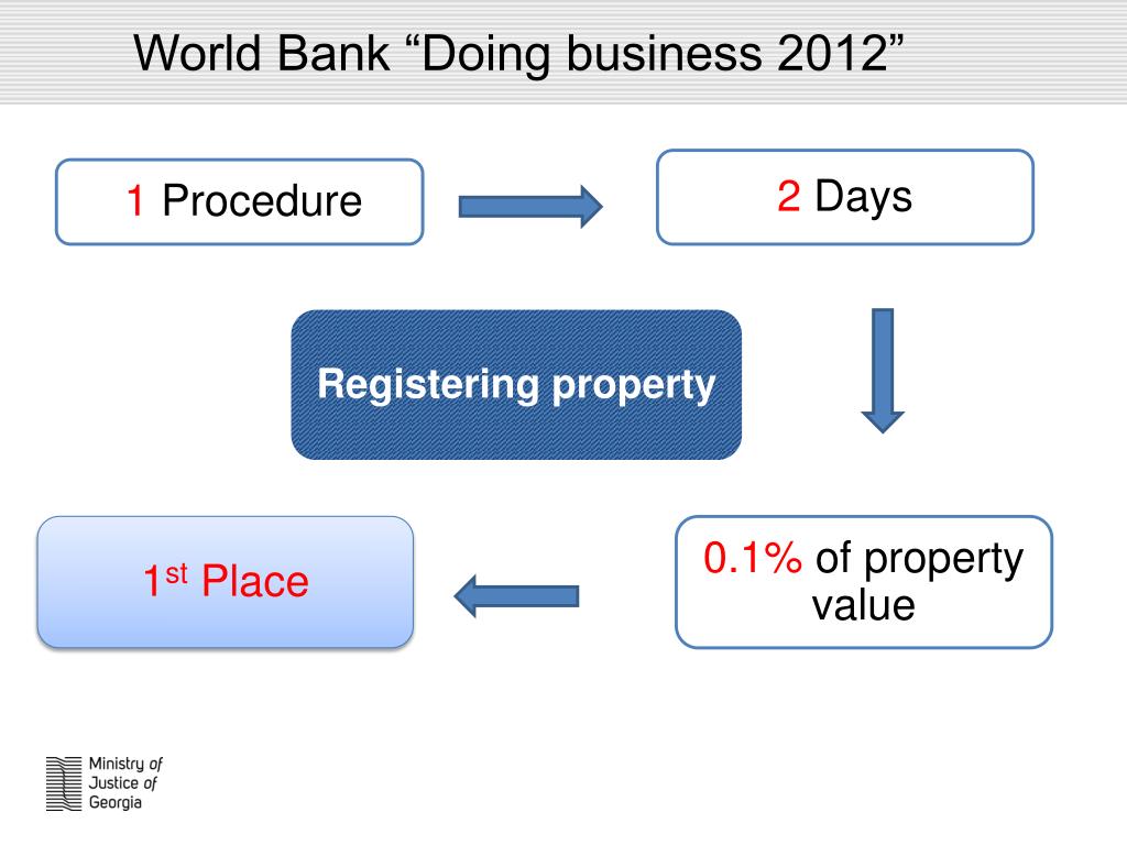World Bank “Doing business 2012” • 2 Days • 1 Procedure • Registering property • 1st Place • 0.1% of property value