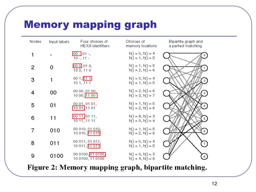 Devising One-to-one Mapping • Simplify the problem (perfect hash function) by HEXA identifier of a node can be modified without changing its meaning and keeping it unique. • Node identifier to contain few additional (say c) bits • We call these c-bits the node’s discriminator • Hence up to 2c memory locations, from which we have to pick just one • Use multiple-choice hashing and cuckoo hashing