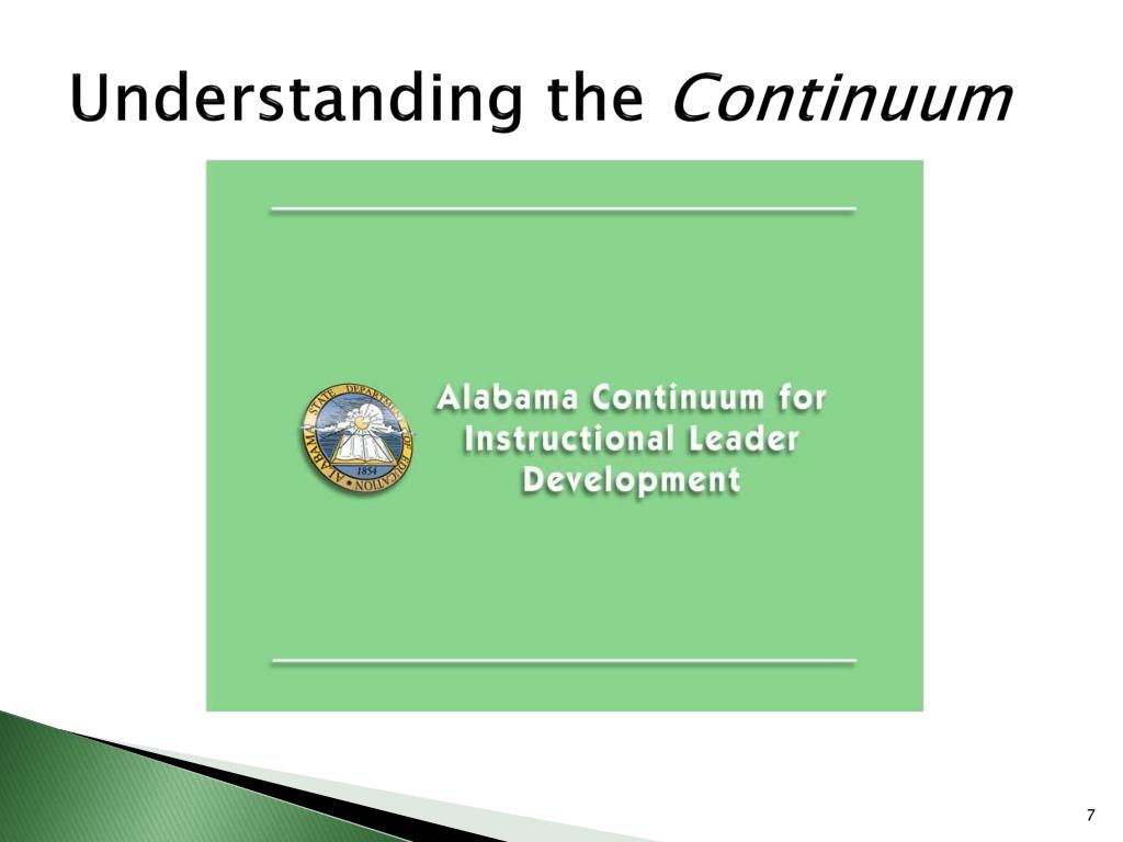 CONTINUUM : Guide to Instructional Leader Professional Development Foundational component for instructional leadership in Alabama. Tool for self-assessment, personal & collegial reflection, goal setting and professional learning. • Professional Study • Leader Evaluation • Leader Mentoring • Leader Induction • Leadership Residency • Leader Preparation