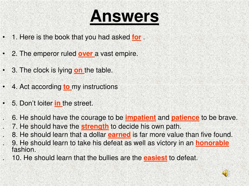 Answers • 1. Here is the book that you had asked for. • 2. The emperor ruled overa vast empire. • 3. The clock is lying on the table. • 4. Act according to my instructions • 5. Don’t loiter in the street. . 6. He should have the courage to beimpatient and patience to be brave. . 7. He should have the strength to decide his own path. . 8. He should learn that a dollar earned is far more value than five found. . 9. He should learn to take his defeat as well as victory in an honorable fashion. . 10. He should learn that the bullies are the easiest to defeat.