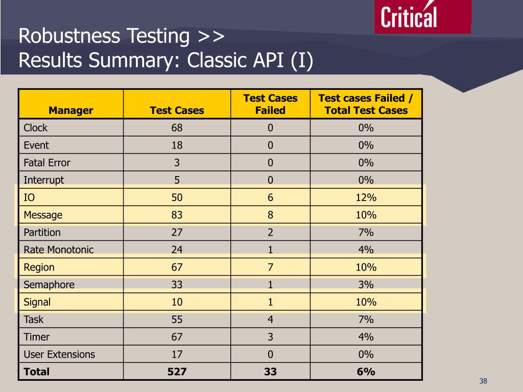 Robustness Testing >> Preparation: Product Analysis – Classic API • ~100 Directives (e.g. System Calls) Initialization Task Clock Fatal Error Timer Event Interrupt Message RTEMS Core Dual Ported Memory Semaphore Signal Partition I/O Region Rate Monotonic Multiprocessing