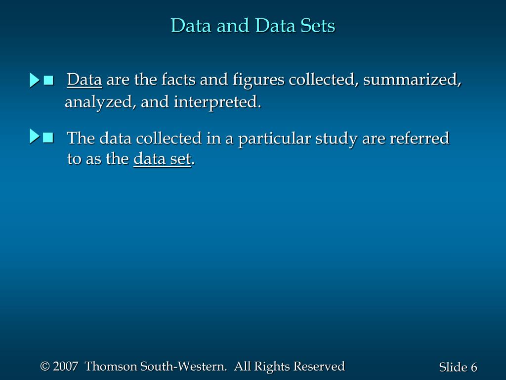 Data and Data Sets • Data are the facts and figures collected, summarized, analyzed, and interpreted. • The data collected in a particular study are referred • to as the data set.