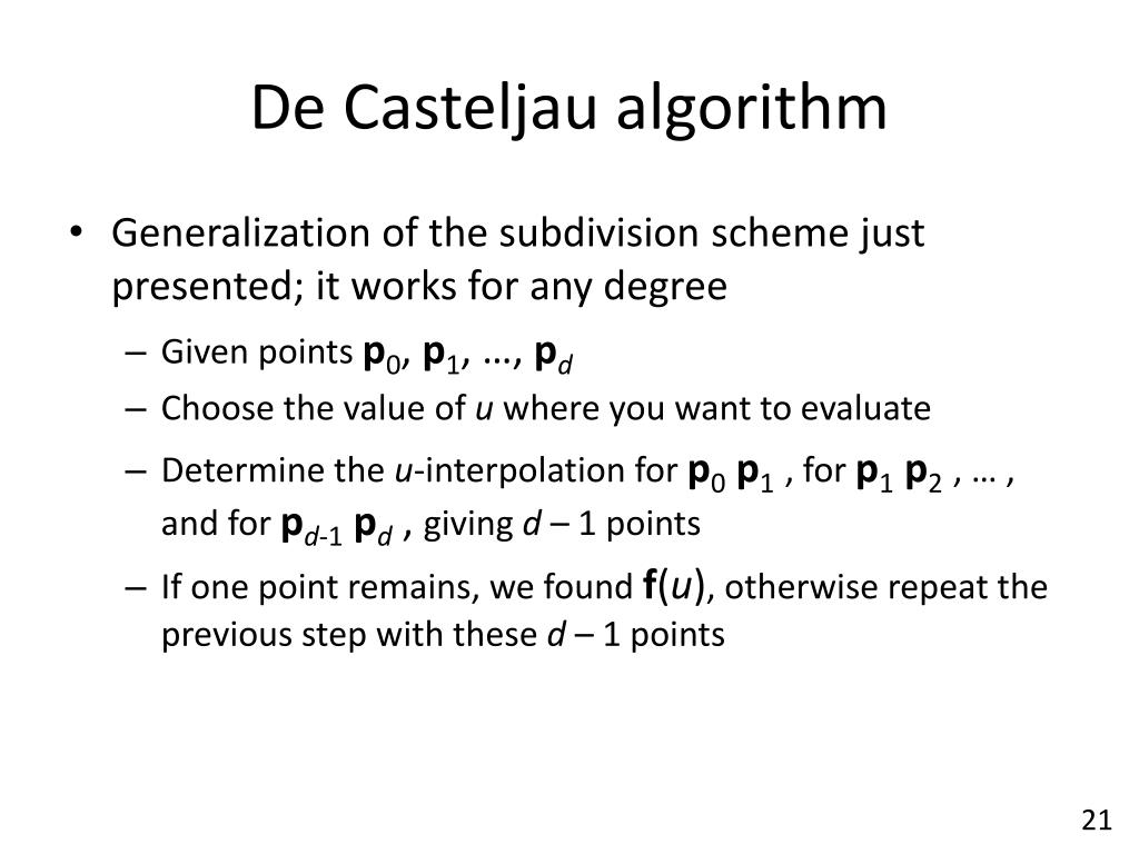 De Casteljau algorithm • Generalization of the subdivision scheme just presented; it works for any degree • Given points p0, p1, …, pd • Choose the value of u where you want to evaluate • Determine the u-interpolation for p0p1, for p1p2, … , and for pd-1pd , giving d – 1 points • If one point remains, we found f(u), otherwise repeat the previous step with these d – 1 points