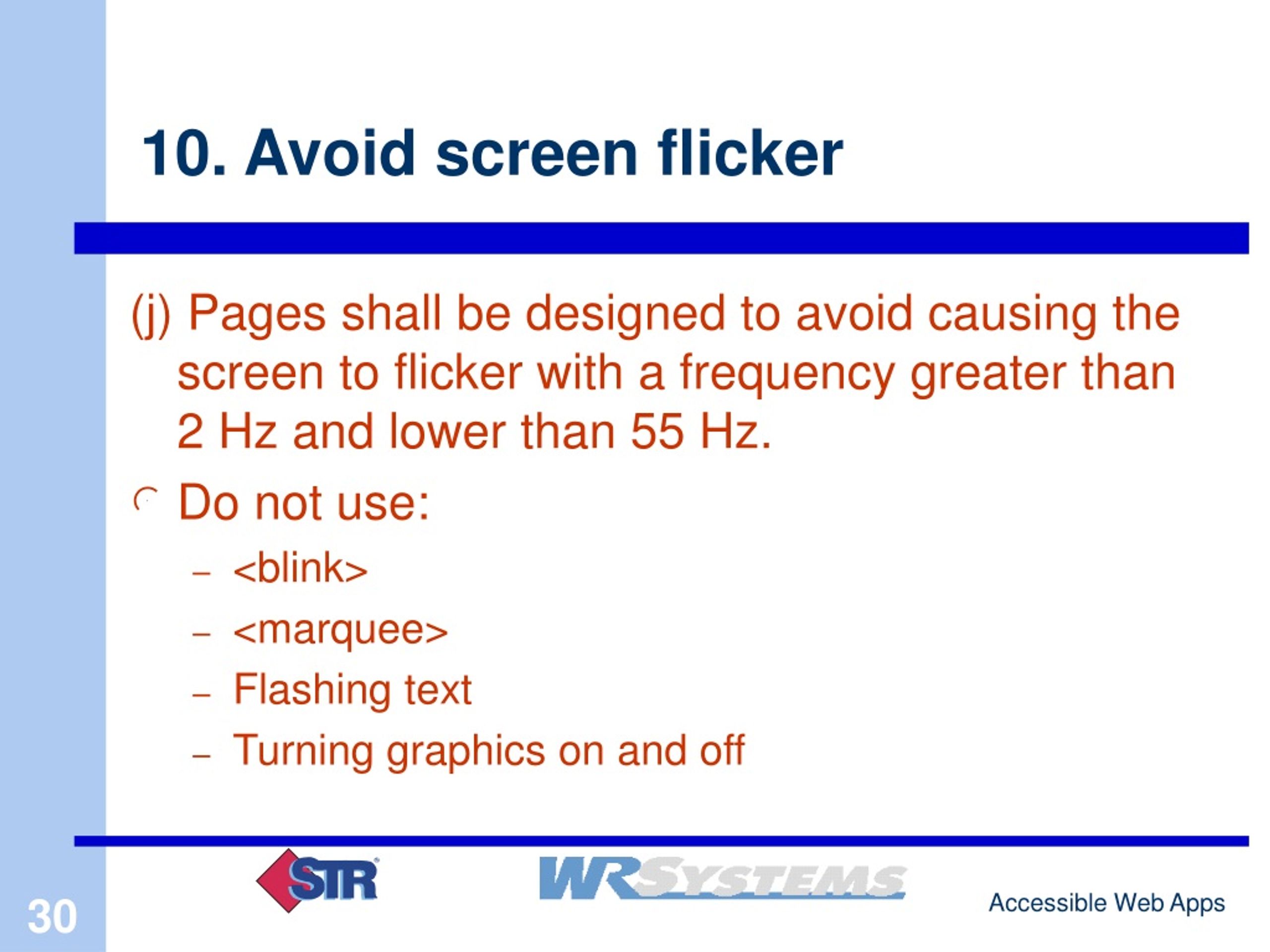 10. Avoid screen flicker (j) Pages shall be designed to avoid causing the screen to flicker with a frequency greater than 2 Hz and lower than 55 Hz. • Do not use: • <blink> • <marquee> • Flashing text • Turning graphics on and off
