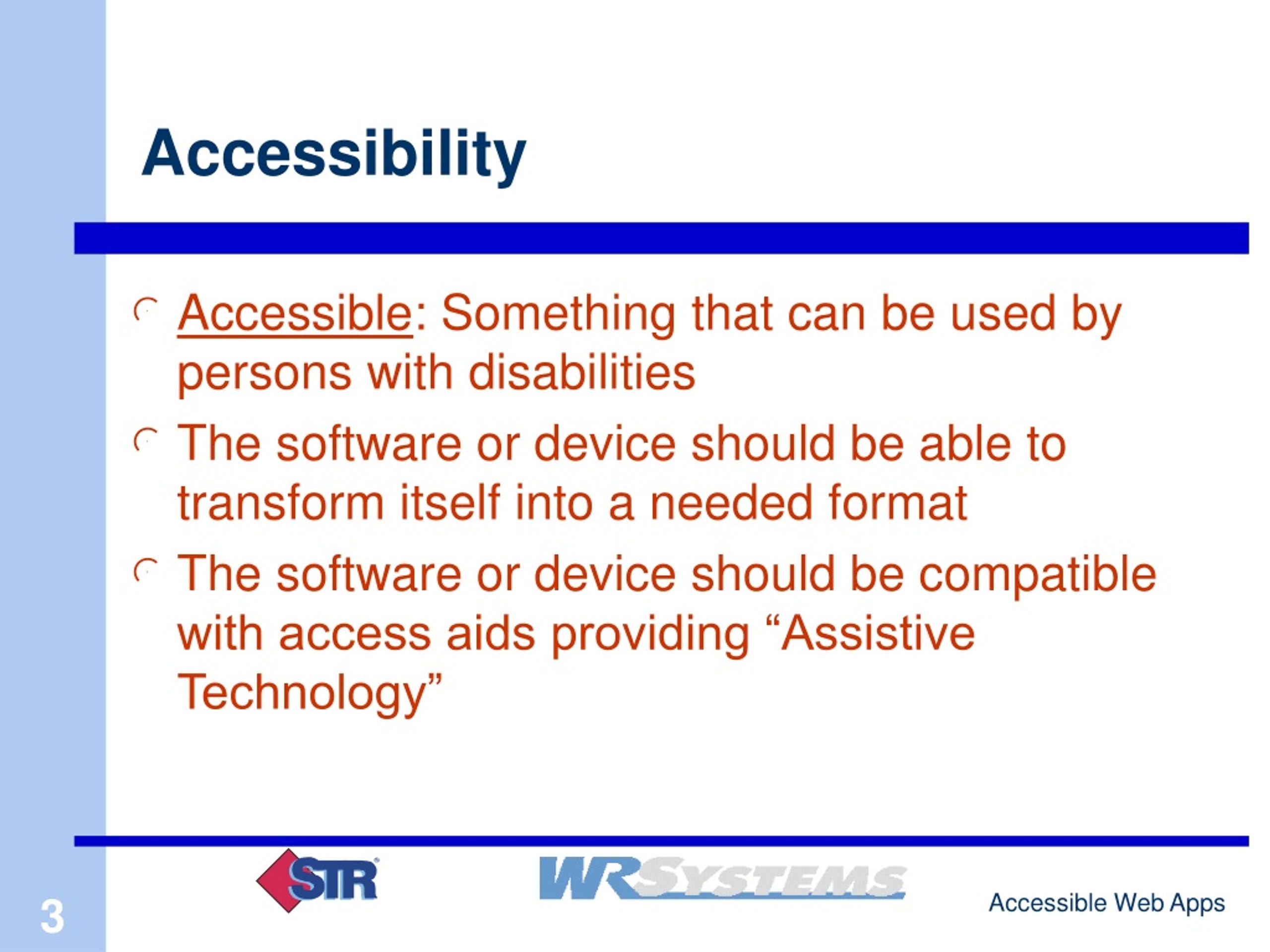 Designing Accessible Web Applications. Leslie M. Tierstein, STR LLC Hilary Benoit, W R Systems, Ltd. Accessible Web Applications. Overview Accessibility and disabilities Assistive devices Accessibility standards Developing accessible applications Software. Accessibility.