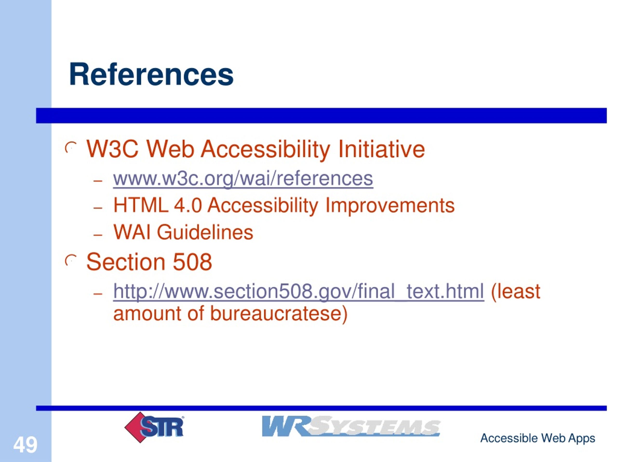 References • W3C Web Accessibility Initiative • www.w3c.org/wai/references • HTML 4.0 Accessibility Improvements • WAI Guidelines • Section 508 • http://www.section508.gov/final_text.html (least amount of bureaucratese)