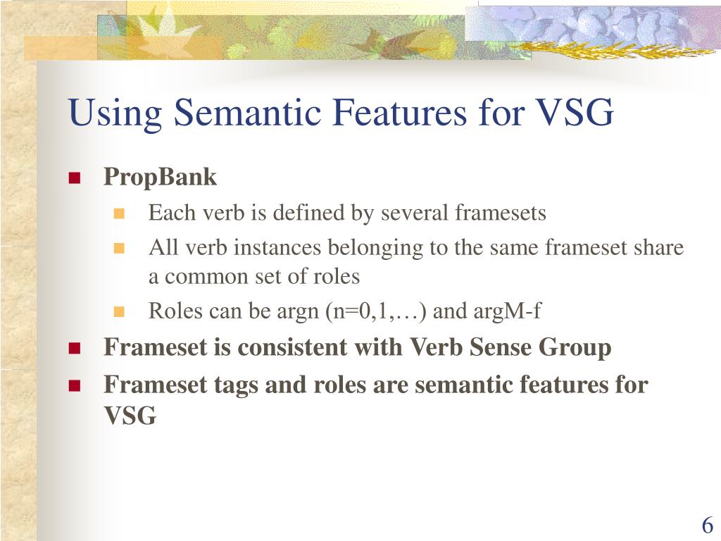 Using Semantic Features for VSG • PropBank • Each verb is defined by several framesets • All verb instances belonging to the same frameset share a common set of roles • Roles can be argn (n=0,1,…) and argM-f • Frameset is consistent with Verb Sense Group • Frameset tags and roles are semantic features for VSG