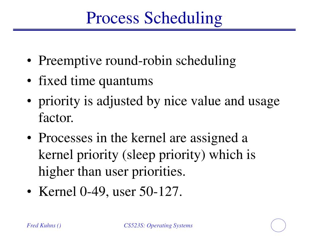 Process Scheduling • Preemptive round-robin scheduling • fixed time quantums • priority is adjusted by nice value and usage factor. • Processes in the kernel are assigned a kernel priority (sleep priority) which is higher than user priorities. • Kernel 0-49, user 50-127. CS523S: Operating Systems