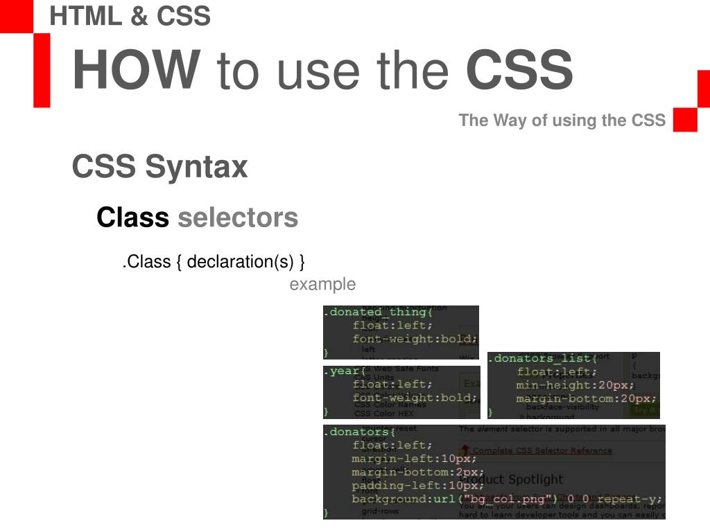 HOW to use the CSS The Way of using the CSS HTML & CSS CSS Syntax Class selectors .Class { declaration(s) } example