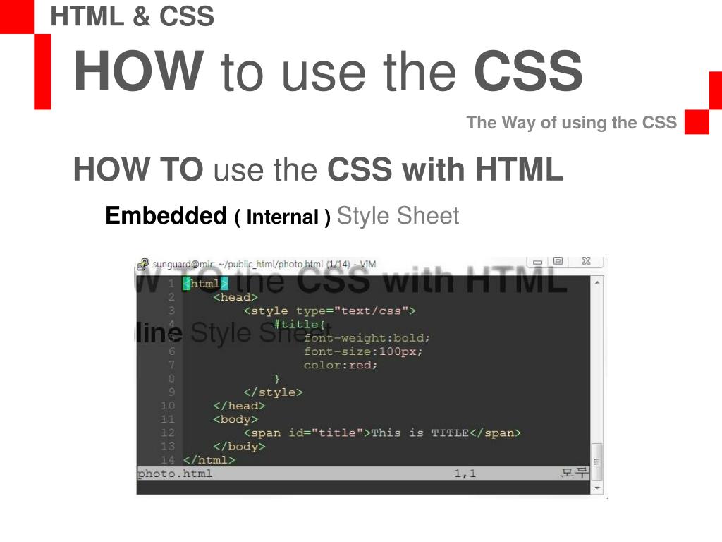 HOW to use the CSS The Way of using the CSS HTML & CSS HOW TO use the CSS with HTML Embedded ( Internal ) Style Sheet