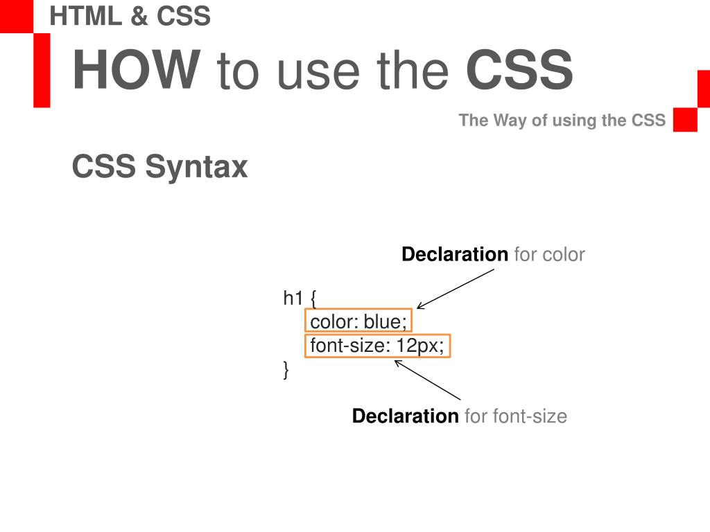 HOW to use the CSS The Way of using the CSS HTML & CSS CSS Syntax Declaration for color h1 { color: blue; font-size: 12px; } Declaration for font-size