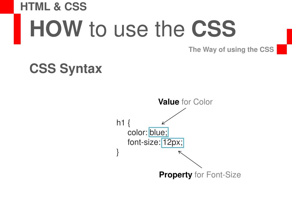 HOW to use the CSS The Way of using the CSS HTML & CSS CSS Syntax Value for Color h1 { color: blue; font-size: 12px; } Property for Font-Size