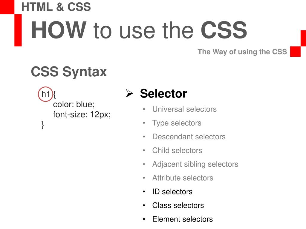 HOW to use the CSS The Way of using the CSS HTML & CSS CSS Syntax Selector h1 { color: blue; font-size: 12px; } • Universal selectors • Type selectors • Descendant selectors • Child selectors • Adjacent sibling selectors • Attribute selectors • ID selectors • Class selectors • Element selectors