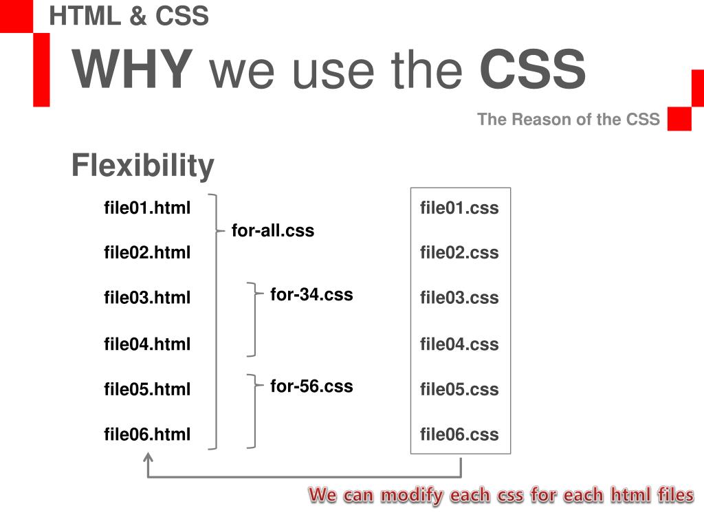 WHY we use the CSS The Reason of the CSS HTML & CSS Flexibility file01.css file01.html for-all.css file02.css file02.html for-34.css file03.css file03.html file04.css file04.html for-56.css file05.css file05.html file06.css file06.html We can modify each css for each html files