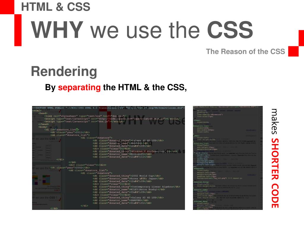 WHY we use the CSS The Reason of the CSS HTML & CSS Rendering By separating the HTML & the CSS, makes SHORTER CODE
