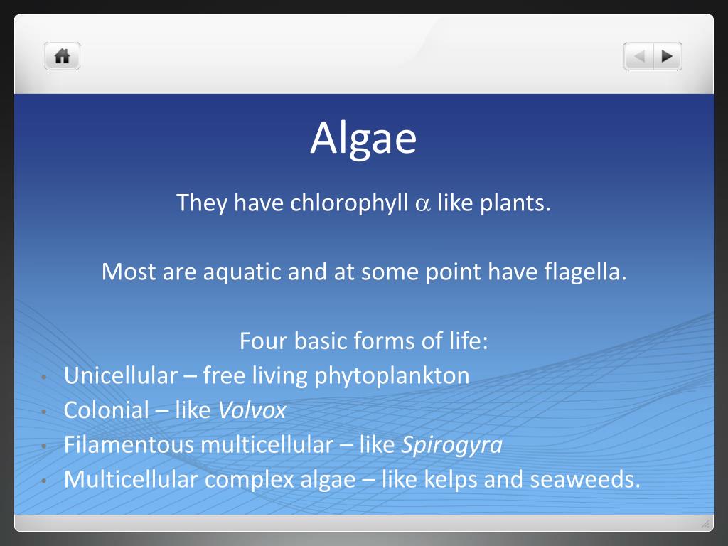 Algae They have chlorophyll a like plants. Most are aquatic and at some point have flagella. Four basic forms of life: Unicellular – free living phytoplankton Colonial – like Volvox Filamentous multicellular – like Spirogyra Multicellular complex algae – like kelps and seaweeds.