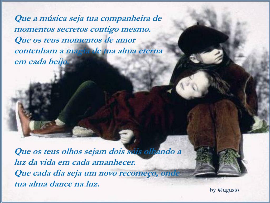 Que a música seja tua companheira de momentos secretos contigo mesmo. Que os teus momentos de amor contenham a magia de tua alma eterna em cada beijo. Que os teus olhos sejam dois sóis olhando a luz da vida em cada amanhecer. Que cada dia seja um novo recomeço, onde tua alma dance na luz.