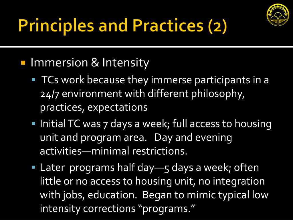 Principles and Practices (2) • Immersion & Intensity • TCs work because they immerse participants in a 24/7 environment with different philosophy, practices, expectations • Initial TC was 7 days a week; full access to housing unit and program area. Day and evening activities—minimal restrictions. • Later programs half day—5 days a week; often little or no access to housing unit, no integration with jobs, education. Began to mimic typical low intensity corrections “programs.”