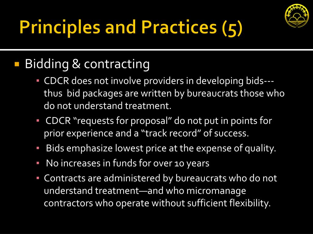 Principles and Practices (5) • Bidding & contracting • CDCR does not involve providers in developing bids---thus bid packages are written by bureaucrats those who do not understand treatment. • CDCR “requests for proposal” do not put in points for prior experience and a “track record” of success. • Bids emphasize lowest price at the expense of quality. • No increases in funds for over 10 years • Contracts are administered by bureaucrats who do not understand treatment—and who micromanage contractors who operate without sufficient flexibility.