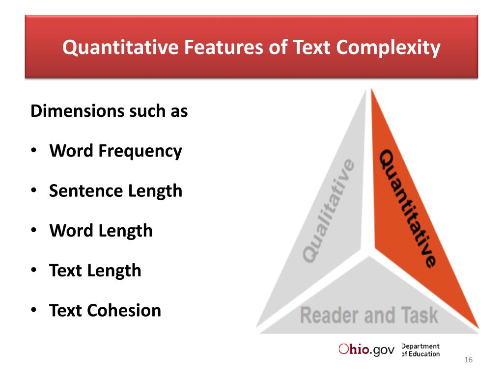 Quantitative Features of Text Complexity Dimensions such as • Word Frequency • Sentence Length • Word Length • Text Length • Text Cohesion